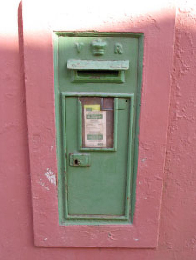 Wall-mounted cast-iron post box, installed c.1880. Raised royal cipher of Queen Victoria to front (south-west) elevation. Set within a raised render surround.