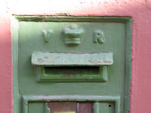This post box has a simple form that is enhanced by the lettering and crown decorations. Post-boxes such as this are becoming increasingly rare throughout Ireland.