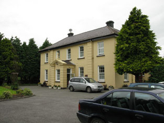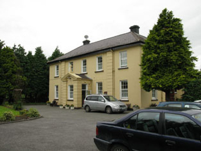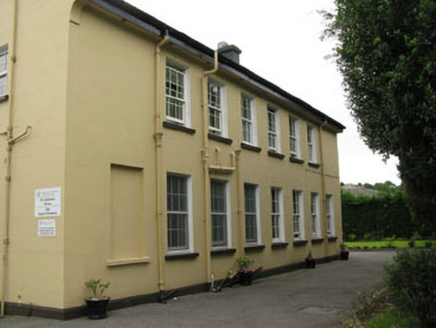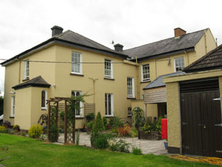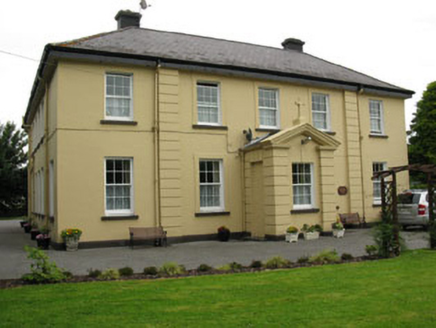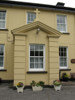 Detached L-plan five-bay two-storey former presbytery, built c.1920, with six-bay return to side (west), gable-fronted porch to front (south) and porch to side (east). Hipped slate roof with timber clad overhanging eaves, having rendered chimneystacks and cast-iron rainwater goods. Rendered pediment to porch surmounted by render cross finial. Lined-and-ruled rendered walls with channelled quoins front elevation and gable-fronted porch. Square-headed window openings with rendered sills throughout, having replacement six-over-six pane timber sliding sash windows. Fixed timber-framed windows to rear (north) elevation, having arcaded round-headed double-light stained glass windows. Round-headed window openings with render sills to side entry porch, having timber-framed stained glass windows to side porch. Square-headed door openings to porches having uPVC doors. Recent outbuilding to rear with hipped clay tiled roof and roughcast rendered walls. Set within own grounds.
