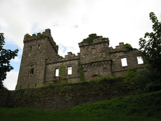 Remains of country house, extant 1837, including five-bay two-storey wing centred on single-bay full-height gabled breakfront; single-bay three-stage tower (north) on a square plan. Burnt, 1922. Demolished, 1967. Now in ruins. Set overlooking Sullane River.