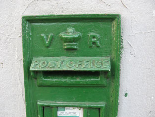Wall-mounted cast-iron letter box, installed c.1880, bearing crown and royal cipher of Queen Victoria.