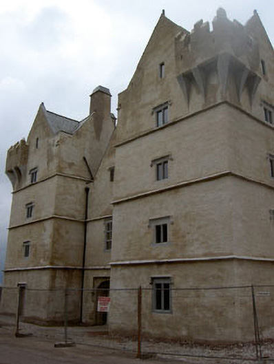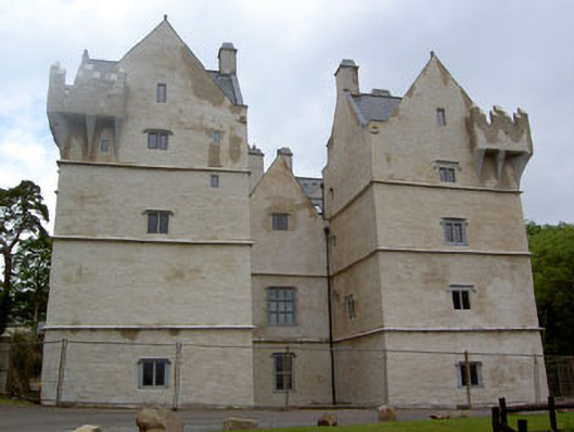Detached fortified house, built 1636, comprising central two-stage core with attic accommodation, having square-plan four-stage with attic accommodation gabled towers with corner bartizans to each corner. Pitched slate roofs with rendered chimneystacks. Stepped crenellations to bartizans, supported on ashlar stone corbels. Rendered walls over rubble stone construction, having ashlar stone string courses between floors. Square-headed openings, having limestone dressings and some label mouldings, set in single, bipartite, tripartite and quarpartite arrangements. Segmental-arch entrance having moulded limestone surround with hood moulding, and pair of recent timber sheet doors.