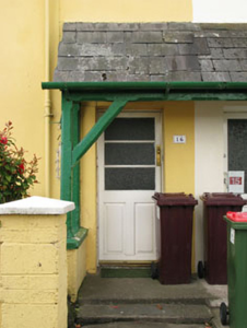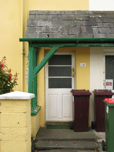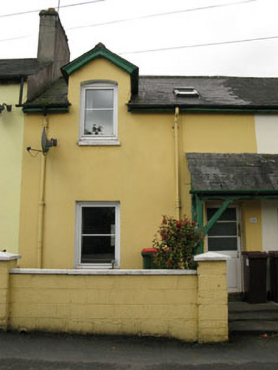 Terraced two-bay single-storey with dormer attic house, built 1876, having shared lean-to canopy on carved timber supporting columns to front (north-east). Recent extension to rear (south-west) Pitched slate roof having rendered chimneystack and cast-iron rainwater goods. Pitched roofed half dormer windows to front and rear (south-west). Rendered walls with timber eaves corbels. Square- and camber-headed window openings with stone sills and uPVC casement windows. Square-headed door opening with glazed timber door and rendered stepped approach. Recent concrete block wall to front.