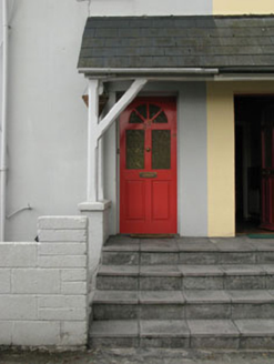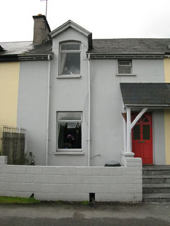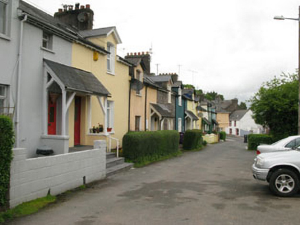 Terraced two-bay single-storey with dormer attic house, built 1876, having shared lean-to canopy on carved timber supporting columns to front (north-east). Flat-roofed single-storey addition to rear (south-west). Pitched slate roof having rendered chimneystack and cast-iron rainwater goods. Pitched roofed half dormer windows to front and rear (south-west). Lined-and-ruled rendered walls with timber eaves corbels. Square- and camber-headed window openings with stone sills and uPVC casement windows. Square-headed door opening with replacement glazed timber door and flagged stepped approach. Concrete block enclosing wall having rectangular-profile piers.