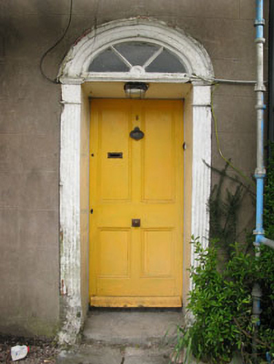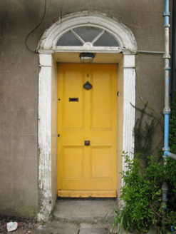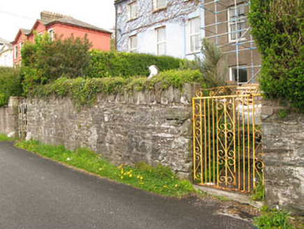 Terraced three-bay three-storey house, built c.1800. Pitched slate roof having rendered chimneystacks, eaves course and uPVC rainwater goods. Lined-and-ruled rendered walls. Diminishing square-headed window openings with tooled limestone sills and one-over-one pane timber sliding sash windows to ground and first floors, timber casement windows to second floor. Round-headed door opening having fluted pilasters surmounted by carved archivolt. Timber panelled door with brass door furniture surmounted by spoked fanlight, having tooled limestone stepped approach. Rubble limestone enclosing wall having single-leaf cast-iron pedestrian gate to east.