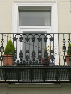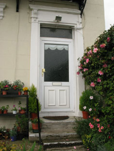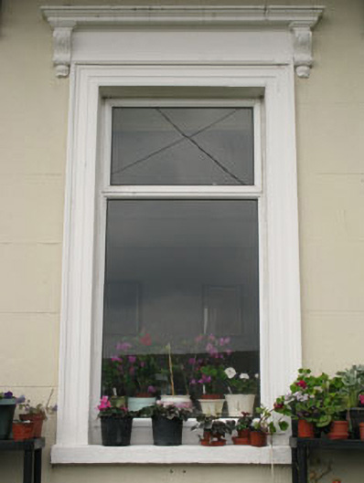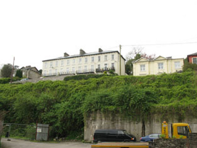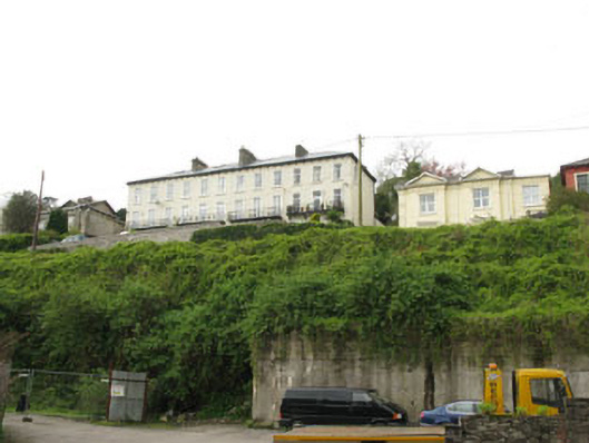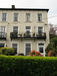 Terraced three-bay three-storey house, built c.1880. Pitched slate roof having rendered chimneystack, timber clad eaves course on carved timber corbels with uPVC rainwater goods. Lined-and-ruled rendered walls having rendered plinth and platband. Cast-iron balcony on supporting brackets to first floor. Diminishing square-headed window openings with render sills and moulded render surrounds. Render moulded canopies on foliated brackets to ground floor openings, uPVC casement windows throughout. Square-headed door opening with raised render surround, surmounted by moulded render canopy on foliated brackets, having uPVC door with overlight and rendered stepped approach. Square-headed door opening with raised render surround to first floor balcony, having uPVC door. Rendered enclosing wall to front having cast-iron pedestrian gate.