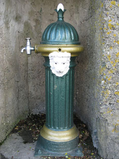 An attractive cast-iron water pump located in its original position. Still in use today, this pump would have once acted as an important communal water source. The banding, fluting and detailed lion’s head are well-designed features of this functional object.