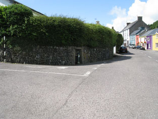 Cast-iron water hydrant, installed c.1900, with banded base, fluted shaft and cap with acorn finial, having lion mask spout. Raised foundry stamp to base. Recently added tap. Located within niche in rubble stone wall at crossroads.