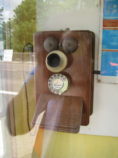 Freestanding moulded concrete telephone box, c.1950, now disused. Painted walls, moulded concrete cap and plinth, with fixed small pane glazed panels and half-glazed timber door. Panels to cap bearing 'Telefón' inscriptions. Panels to base bearing 'P & T' inscription. Replacement vintage telephone to interior.