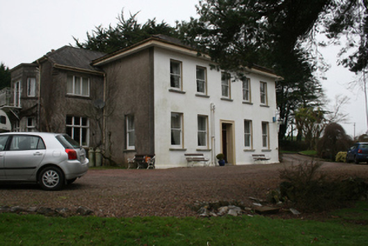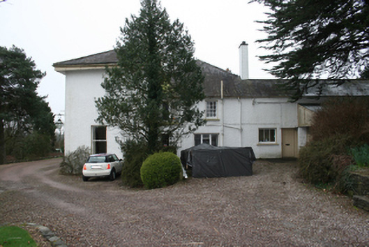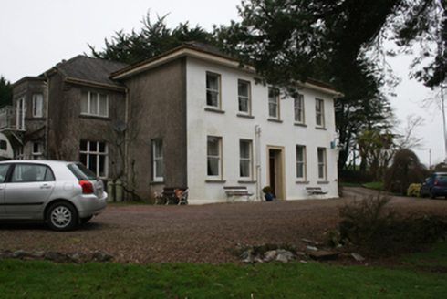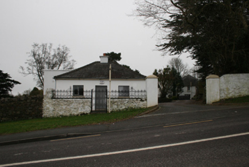 Detached five-bay two-storey former country house, built c.1830, with return to rear (west), three-bay two-storey extension with full-height canted bay to rear of main block, c.1910 and single-storey flat-roofed extension c.1980 to south-west corner. Now in use as private house. Hipped (main), pitched (return), and half-hipped (extension) slate roofs, smooth-rendered chimneystacks, stepped kneelers to south gable of extension, projecting timber-sheeted eaves to main block, cast-iron rainwater goods. Lined-and-ruled rendered to front (east) elevation, roughcast render to all other elevations. Square-headed window openings, some stone sills, one-over-one timber sash windows to main block, some six-over-six sliding sash windows to north elevation of return, fixed timber tripartite casements with transoms and mullions to canted bay, uPVC windows to remainder. Square-headed door opening with raised rendered architrave with recessed timber panelled door and stained glass overlight. Detached three-bay single-storey gate lodge, built c.1830, now in use as a veterinary surgery with flat-roofed extension with protruding rooflights to rear. Hipped slate roof with replacement aluminium rainwater goods. Nap rendered walls. Square-headed window openings with replacement timber casement windows. Square-headed door opening with replacement door. Random wall supporting wrought-iron railings and pedestrian gate. Square profile piers to main vehicular entrance.