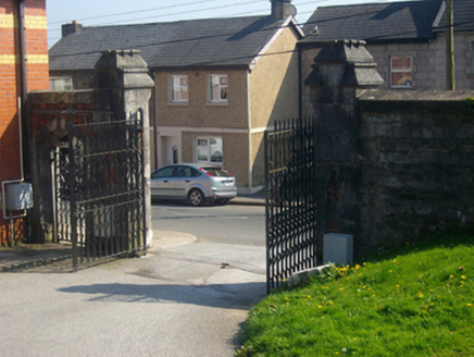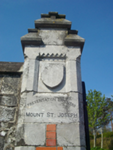 Entrance gates, built c.1890, comprising square-profile dressed limestone piers with chamfered corners, red brick panels, recessed panel with dog-tooth carving and blank plaques and stepped carved limestone caps. ‘PRESENTATION BROTHERS MOUNT ST JOSEPH’ inscribed to west pier. Set in rubble limestone with saddleback coping. Pointed arch pedestrian gate to east set in red brick wall with limestone saddleback coping and limestone surround to gateway. Wrought-iron gates. Forms entrance to Mount St Joseph with gate lodge to east.