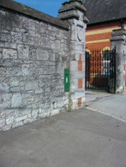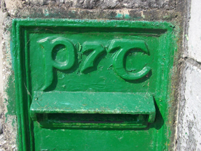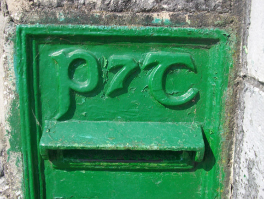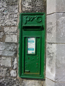 Wall-mounted cast-iron post box, c.1930, with raised ‘P & T’ initials. Set into limestone wall at entrance to Presentation Brothers, Mount St Joseph.