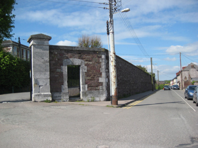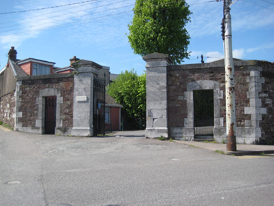 Entrance gates and boundary wall of St Vincent’s convent grounds on St Mary’s Road, built c.1845. Square-profile limestone gate piers to south-east having ashlar limestone chamfered plinth and pyramidal caps, holding cast-iron vehicular gates. Square-headed pedestrian entrances to north and south in limestone block-and-start surrounds holding cast-iron gates. Recent gate lodge to north. Roughly coursed rubble sandstone boundary walls with dressed limestone quoins, chamfered at corner of Vincent’s Avenue and having ashlar limestone coping. Square-headed openings with limestone and red brick surrounds having metal sheeted gates. Loopholes and blocked entrances to north-east section.