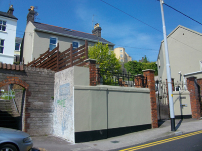 Detached three-bay two-storey house, built c.1880, with canted bay and box bay windows to south. Pitched slate roof with clay ridge tiles, rendered corbelled chimneystacks having clay pots, rooflight and uPVC rainwater goods to overhanging eaves. Smooth rendered walls. Camber-headed window openings with painted sills and uPVC sash windows. Square-headed window openings to bay windows. Round-headed door opening with moulded render surround and timber and glass door. Set back from street on elevated site with rendered retaining wall forming platform to front of house and rendered boundary wall to street with red brick gate piers and wrought-iron railings and gates.