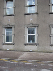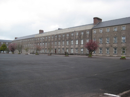 Detached forty-five-bay three-storey military barracks with breakfront fifteen-bay central section, built c.1805, as officers’ quarters. Originally on an L-shaped plan. Now in use as infantry barracks. Hipped artificial slate roof with raised verges, four red brick chimneystacks and cast-iron rainwater goods. Ashlar limestone stepped parapet to central section. Smooth rendered walls with rendered quoins to corners. Square-headed window openings with limestone block-and-start surrounds and cut stone sills, all now with replacement windows. Round-headed doorcases with limestone block-and-start surrounds, square-headed opening to southern section, replacement timber doors and plain fanlights over. Forming east side of parade grounds.