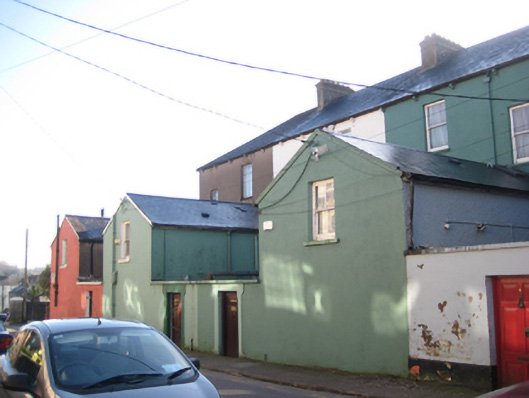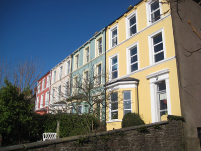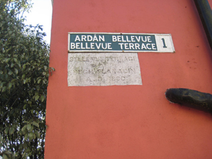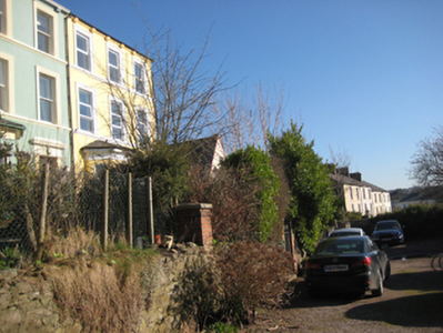 Terrace of four three-bay three-storey houses, dated 1880, with canted bay windows. Pitched slate roofs with rendered chimneystacks and cast-iron rainwater goods to corbelled eaves. Smooth rendered walls with moulded continuous sill courses to first and second floor windows. Inscribed plaque to rear elevation. Square-headed window openings in moulded render surrounds with one-over-one timber sash windows. Render sills to canted bays. uPVC windows to some houses. Square-headed door openings in moulded render surrounds having engaged Ionic pilasters surmounted by architrave and painted timber panelled doors with plain glass overlights. Replacement doors to some houses. Set back from street with rubble stone boundary wall and cast-iron pedestrian gate to red brick square-profile piers having stone pyramidal caps. Steps lead from gate to front door. Terrace is located in a cul-de-sac on a height facing south and accessed via laneway.