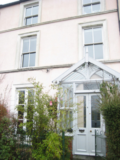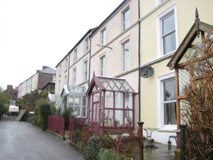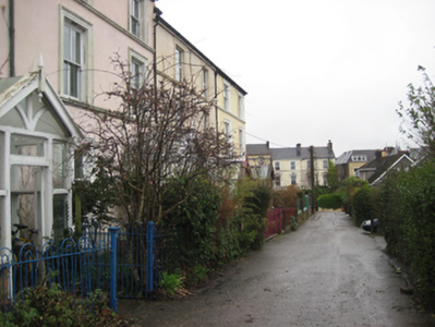 Terrace of five two-bay three-storey houses, built c.1890, with gable-fronted glazed entrance porches at front (south) elevation. Pitched slate roofs with rendered chimneystacks having clay pots and cast-iron rainwater goods. Pitched glass roofs to porches with timber finials and timber bargeboards having incised trefoil motifs. Smooth rendered walls with continuous sill courses to first and ground floor windows. Square-headed window openings in moulded render surrounds with two-over-two timber sliding sash windows. Some replacement windows. Square-headed door openings to entrance porches with timber-and-glazed double doors and plain-glazed overlight. Set back from the road with hoped iron railings.