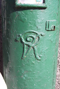 Freestanding cast-iron post box, c.1890. Shallow domed capping with dentil enriched sides and hinged door bearing the V.R. insignia in raised lettering.