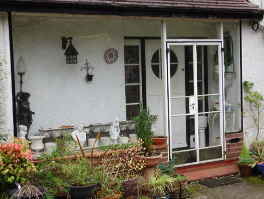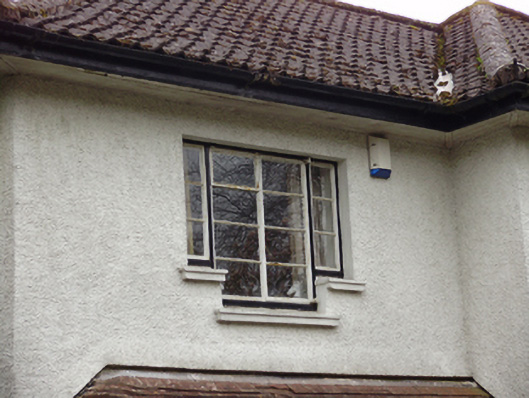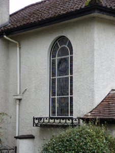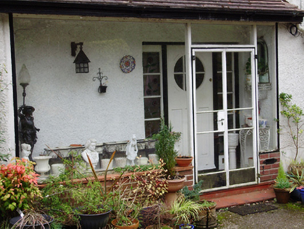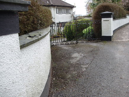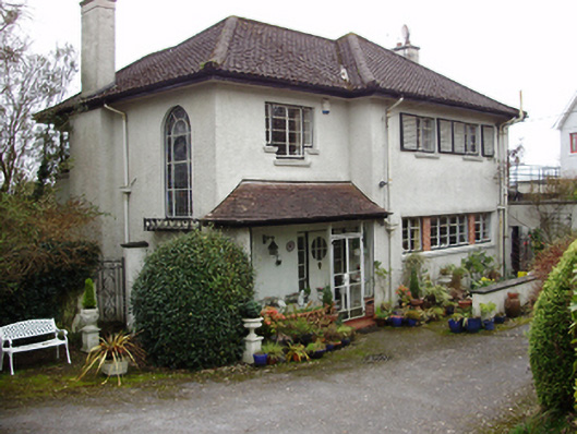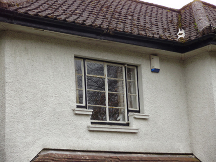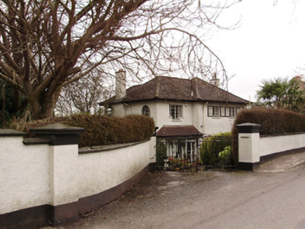 Detached three-bay two-storey house, designed 1950; built 1952, with hipped canopy to recessed front (north) entrance bay, now glazed. Hipped tile roof with roughcast rendered chimneystacks and cast-iron rainwater goods. Roughcast rendered walls. Square-headed window openings with render sills and metal casement windows. Step sills to tripartite window to front elevation. Round-headed metal stairwell window to east elevation with margin lights, spoked fanlight and stained glass. Square-headed door opening beneath canopy with timber-and-glazed door having sidelights. Set within its own grounds with rendered boundary wall and roughcast rendered piers and rendered caps to wrought-iron gates.