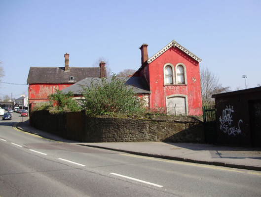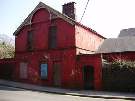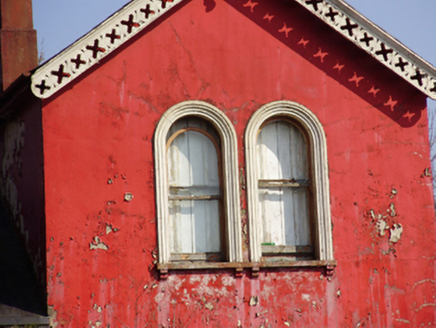 Detached multiple-bay two-storey house, built c.1860, having hipped and lean-to extensions to north connecting gable-fronted block. Now disused. Pitched slate roof with rendered and red brick chimneystacks, timber bargeboards to gables and some remaining cast-iron rainwater goods. Rendered walls. Round- and segmental-headed window openings to western gable with moulded render surrounds. Round-headed openings having one-over-one pane timber sliding sash windows, blocked to ground floor. Square-headed window openings to north and east elevations with two-over-two pane timber sliding sash windows. Render surrounds to north gable. Square-headed door opening to north elevation with render surround, now blocked. Segmental-headed door opening to north with timber panelled door. Rendered boundary wall to east, with rubble stone boundary wall to west. Fronts directly onto street.