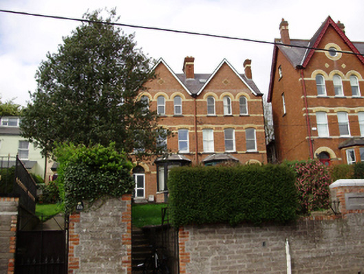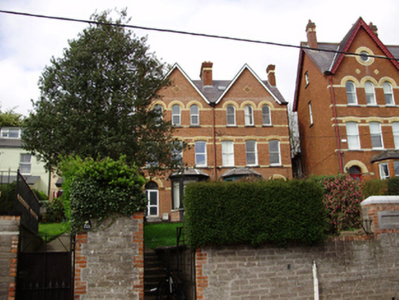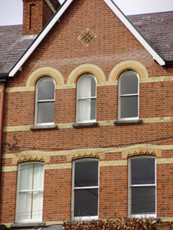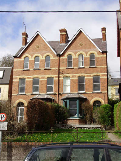 Pair of semi-detached three-bay three-storey houses, built c.1880, with gablets and canted bay windows to ground floor. Pitched slate roofs with red brick chimneystacks having yellow brick string course and cast-iron rainwater goods. Red brick walls laid in Flemish bond with yellow brick string courses. Round-, camber- and-square-headed window openings with decorative yellow brick voussoirs, cut limestone sills and one-over-one pane timber sliding sash windows . Round-headed door openings with yellow terracotta voussoirs, cut limestone steps and half-glazed doors with leaded stained glass. Wrought-iron pedestrian gate and railings on concrete block boundary wall to front.