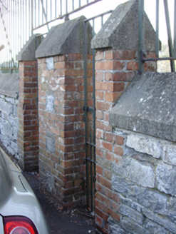 Entrance gates and boundary railing, built c.1920, comprising roughly dressed limestone boundary wall with render coping, wrought-iron railings and gates and red brick piers with pointed render to paired pedestrian entrances.