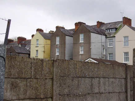 Terrace of three two-bay three-storey houses with dormer attic, built c.1880, having full-height canted bay windows with gables above to end houses and two-storey canted-bay window to centre house. Three-storey returns to rear (north) elevations. Western two houses now in single use as guest house. Pitched slate roofs with red brick chimneystacks and cast-iron rainwater goods on rendered eaves course. Rendered walls with continuous sill courses and mock Tudor render detailing to gables. Square-headed window openings with moulded render surrounds and replacement uPVC windows. Square-headed door openings with moulded render surrounds, fluted frieze with canopies above to end houses and timber panelled doors with overlights. Rendered boundary walls with cast- and-wrought-iron railings to front of site.