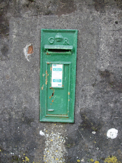 Cast-iron post box, c.1915, with G.R. Royal cipher and crown motif. Set in concrete wall.