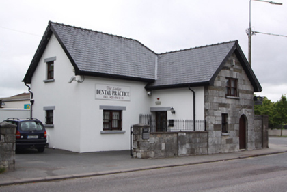 Detached gable-fronted two-bay single-storey with attic former gate lodge, built c.1870, now in use as dental surgery. Two-storey extension to north. Pitched artificial slate roof with overhanging eaves, replacement carved timber bargeboards to the original block, recent rooflights and uPVC rainwater goods. Coursed squared limestone block having bands of squared sandstone to front elevation, squared rubble stone walls to north-east elevation and smooth rendered walls to extension and south-west. Square-headed window openings with limestone sills, limestone voussoirs to window heads and one-over-one timber sash windows. Paired windows to most openings. Pointed arched door opening with replacement fixed sheeted timber door. Square-headed door opening to northeast elevation, blocked up. Squared limestone boundary wall adjoins the front of the building on either side along the road, with that to the south topped by replacement cast-iron railings.