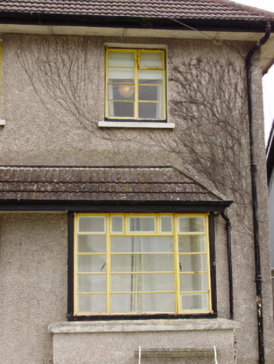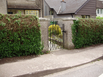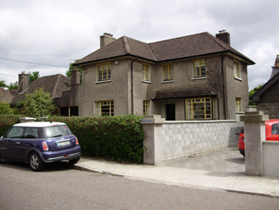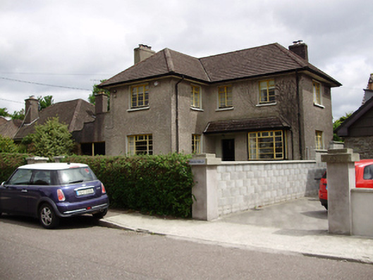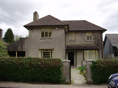 Detached L-plan three-bay two-storey house, built c.1940, having box bay window, lean-to open porch extending over bay window and garage to north. Hipped tiled roof with roughcast rendered chimneystacks, overhanging eaves and cast-iron rainwater goods. Roughcast rendered walls. Square-headed window openings with iron casement windows and render sills. Square-headed door opening with timber panelled door. Wrought-iron pedestrian and vehicle gates to front having flanking roughcast rendered piers.