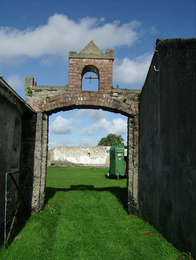 Detached three-bay two-storey house, built c. 1860, incorporating fabric of earlier building, having four-bay rear elevation and three-bay side elevations, south having five-bay ground floor. Single-storey bay window projection to south eleavtion and portico to east, both added c. 1965 and both having balustraded flat roofs. Three-bay single-storey projection to west, rebuilt 1986. Skirt slate roof with projecting eaves, rendered chimneystacks with moulded copings, and cast-iron rainwater goods. Rendered walls covered with Virginia creeper. Square-headed window openings to first floor and to most of rear and west elevations. Round-headed windows to ground floor of front and south elevations, inserted c.1965 and replacing bay windows, and round-headed stairs window to west. Some timber sliding sash windows, first floor end bays of front elevation and all of north elevation having one-over-one pane windows, and south elevation first floor end bays having six-over-six pane windows. Replacement windows and French doors elsewhere. Round-headed entrance doorway with timber glazed double-leaf door, fanlight and portico, inserted c. 1965, replacing doorway formerly in south elevation. Yard to rear enclosed by single-storey farm buildings, having camber-arch gateway to north with brick voussoirs and bellcote, leading to second yard to north. Two-storey ranges of farm buildings on east side of north yard, having hipped slate roofs, rubble limestone walls and with pair of elliptical vehicular entrances, and square-headed door and window openings, and with external steps to mid-façade accessing first floor. Entrance gates to south-east with rendered panelled piers having dentillated caps, curving walls leading to similar outer piers and wrought-iron double-leaf vehicular gates.