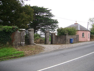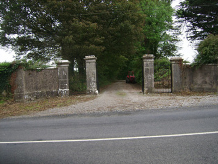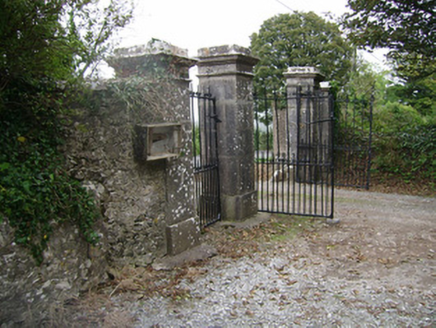 Entrance gates to Kilbrack House, erected c. 1840, comprising square-profile ashlar limestone piers with plinths and moulded caps, having double-leaf wrought-iron vehicular gates with decorative details and limestone wheel guards, and having similar piers and gates to flanking pedestrian openings. Curved rendered walls to ends, having cut-stone copings and plinths, teminating in piers similar to those of gates. Gate lodge straddling demesne wall to west.