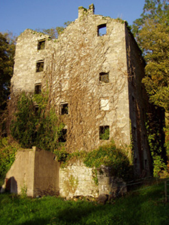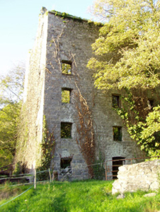 Detached double-pile four-bay six-storey flour mill, built c. 1820, now in disuse and roofless. Concrete-walled single-bay single-storey extension to west elevation. Chimneystack to south gable of west elevation. Coursed rubble limestone masonry walls with camber-arched window and door openings having roughly dressed voussoirs and some openings having brick voussoirs. Mill race and wheel pit to site, with remains of cast-iron machinery and metal sluice.