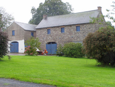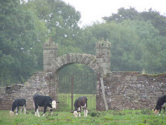 Group of former demesne outbuildings, built c.1900, to south of site of demolished Castle Cooke. Now in use as farm outbuildings. Comprising three-bay two-storey outbuilding to south-west and three-bay two-storey laundry to north-west, two-bay two-storey outbuilding to north-east, two-bay two-storey building to south-east, and walled garden to east. Outbuilding to south-east having pitched slate roof and rendered walls with render date-stone. Square-headed window openings with timber fittings. Segmental-headed opening with corrugated-iron door. South-west building has pitched slate roof with brick chimneystacks, rubble sandstone walls, having decorative terracotta date-stone '1893' to north gable, over oculus with brick surround, square-headed window openings with timber fittings, brick voussoirs and render sills, segmental-arched vehicular entrance with dressed sandstone voussoirs and square-headed door opening, both entrances having corrugated-iron doors. Flight of limestone steps to south gable, leading to square-headed timber battened door with Ballyhooly marble threshold. Laundry building now roofless, having coursed sandstone walls with flight of limestone steps leading to first floor door opening, square-headed window openings with sandstone sills, square-headed door opening with dressed sandstone voussoirs and segmental-headed door openings under flight of steps and having slightly projecting voussoirs. North-east outbuilding now roofless, having square-headed window openings with render sills and square-headed door openings with dressed limestone voussoirs. South-east building has pitched slate roof and concrete walls, with square-headed windows, and segmental-arched vehicular entrance and inscribed date '1913' and initials to front gable. Walled garden to rear having segmental-headed archway with wrought-iron double-leaf gates and coursed sandstone walls. Walled garden to north-east having segmental-headed archway with sandstone voussoirs and flanking square-profile columns with crenellated caps, coursed sandstone walls. Pair of painted rendered piers to road entrance with cast-iron gates.