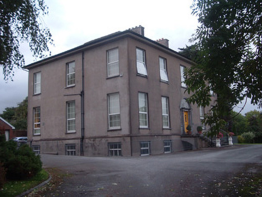 Detached five-bay two-storey over half-basement country house, built c. 1800, facing south. Hipped slate overhanging roof having rendered chimneystacks. Rendered walls having render plinth course and render eaves course with projecting timber eaves. Square-headed window openings having some limestone sills. Mainly replacement uPVC windows, with some timber sliding sash windows to rear and east elevation, six-over-six pane to first floor and nine-over-six pane to ground floor, with replacement timber windows to basement. Round-headed window opening to rear having nine-over-six pane timber sliding sash window with batwing fanlight. Oval window opening below round-headed window, having spoked frame. Round-headed carved limestone doorcase to main entrance, having timber panelled double-leaf door flanked by engaged columns with fern-leaf capitals and moulded plinths, flanked in turn by sidelights with ornate glazing, all surmounted by cornice, moulded to doorway and with guilloche pattern over sidelights, and with ornate batwing fanlight above. Approached by flight of limestone steps with replacement metal railings. Curved entrance gateway over disused canal, having rendererd walls with tooled limestone copings and square-plan ashlar limestone piers with wrought-iron double-leaf vehicular gates and pedestrian gates. House name incised on vehicular piers.