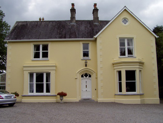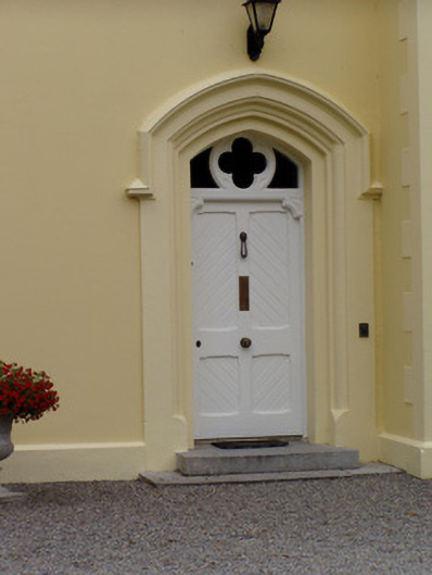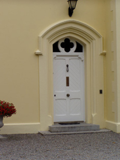 Detached three-bay two-storey house, built c. 1880, with slightly projecting gabled north end bay to front, two-bay two-storey addition to south end of rear elevation and recent lean-to conservatory to south elevation. Front elevation has bay windows to ground floor, canted to projecting bay and box to south end bay. Pitched slate roofs with rendered chimneystacks. Painted rendered walls, with rendered quoins and plinth course to front elevation. Square-headed one-over-one pane timber sliding sash windows with cut limestone sills, first floor having double windows and render surrounds. Bay windows have tripartite windows, with moulded cornices and string courses, box-bay window having chamgered surround. Oculus to projecting bay, having quatrefoil window in round opening. Tudor arch opening with moulded render surround, with hood-moulding, having overlight with quatrefoil detail, carved timber panelled door, and limestone steps. Square-profile painted rendered piers and boundary walls with rendered coping.