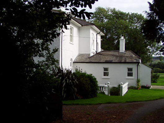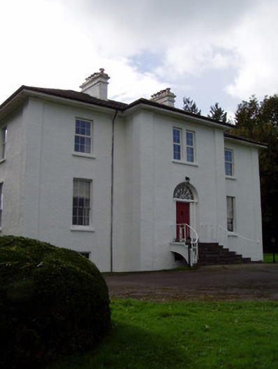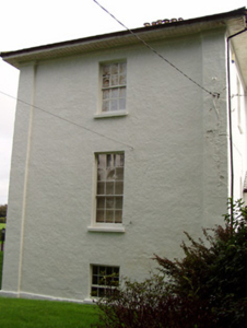 Detached three-bay two-storey over half-basement house, dated 1834, having entrance breakfront to front elevation and stairs return to rear, with two-bay single-storey over basement extension to rear, having recent lean-to single-storey extension. Hipped slate roof with overhanging eaves, render eaves course and rendered chimneystacks. Half-hipped slate roof to additon, with rendered chimneystack. Painted rendered walls with render plinth course and giant order Doric-style pilasters to corners and to breakfront. Painted limestone date plaque to rear. Square-headed window openings with nine-over-six pane timber sliding sash windows to ground floor of front elevation and gables, six-over-six pane window to first floor of north gable, and round-headed margined six-over-six pane window to rear return with spoked fanlight. Round-headed window to rear elevation having double-light timber casement windows with spoked fanlight. Replacement uPVC windows elsewhere, paired to first floor of windbreak. All windows having painted stone sills. Round-headed door opening with ornate cobweb fanlight over timber panelled door flanked by engaged Doric-style columns with limestone plinths, approached by flight of diminishing limestone steps with cast-iron railings having decorative finials to newels. Square-profile painted rendered piers with caps and wrought-iron double-leaf vehicular and pedestrian gates, set to painted rendered walls.