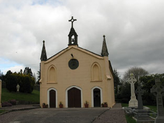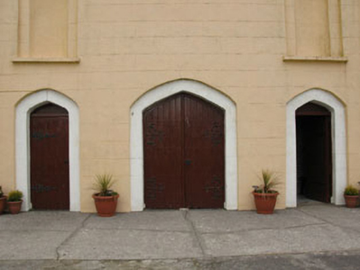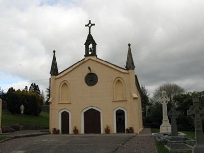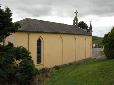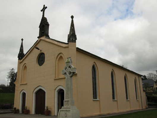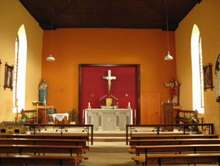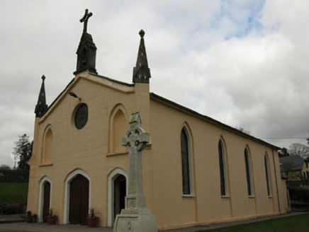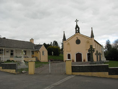 Freestanding barn style gable-fronted church, built c.1830, comprising four-bay double-height nave with sacristy to rear (east). Later service extensions to rear. Hipped slate roof with gable to front elevation having tooled limestone bellcote with cross, copings and pinnacles. Pitched artificial slate roofs to sacristy and extensions. uPVC rainwater goods throughout. Lined-and-ruled rendered wall to front elevation having pointed arch statuary niches to front elevation. Rendered walls to side (north, south) and rear elevations having pointed arch recesses to side elevations of nave. Oculus window opening with stained glass window to front elevation. Pointed arch window openings with rendered sills to nave having stained glass windows set in recesses. Blind window openings to north elevation of nave. Pointed arch window opening with render sill to sacristy having timber framed quarry glazed sliding sash window. Pointed arch door openings to front elevation, set within shallow pointed arch recesses. Single and double-leaf timber battened doors with iron strap hinges. Timber battened ceiling to interior with carved timber gallery supported on timber columns to rear (west). Seven-bay single-storey national school to north-east, built c.1845, with projecting entrance porches and extension to west. Pitched slate roof. Roughcast rendered walls. Limestone date plaque to front elevation. Square-headed window openings with uPVC windows. Square-profile piers to rendered and brick enclosing wall flanking wrought-iron gate and pedestrian turn style.