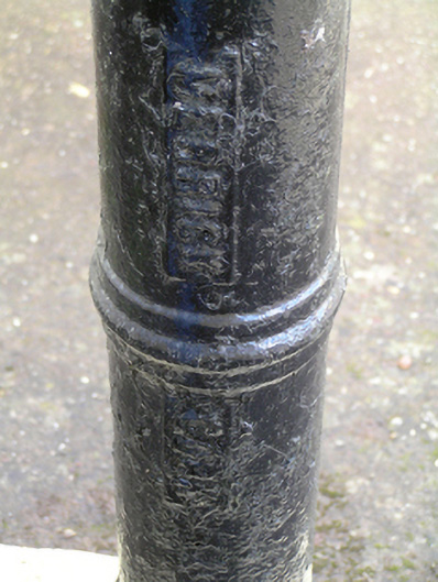 Cast-iron water pump, erected c. 1870. Banded shaft, spout, cap and finial. Curved handle. Maker's mark to shaft.