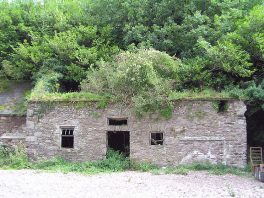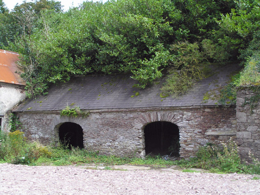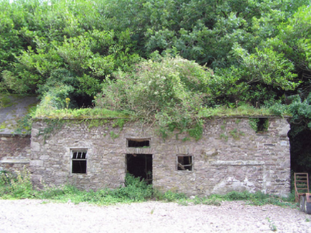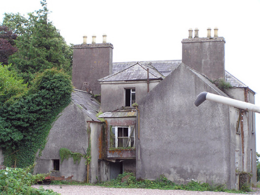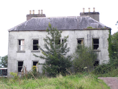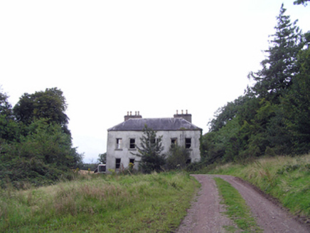 Detached U-plan five-bay two-storey country house, built c. 1770, now vacant. Comprising main south block with two pitched roofed blocks at right angles to rear (north). Having gabled formerly glazed corrugated-iron porch to front (south) elevation and single-bay two-storey extension with hipped roof between rear blocks and further single-bay single-storey lean-to extension to this. Hipped slate roofs with rendered chimneystacks and cast-iron rainwater goods. Rendered walls. Square-headed openings with remains of one-over-one pane timber sliding sash windows to front elevation, two-over-two pane and bipartite six-over-six pane to east elevation. Venetian window opening to central bay of first floor having round-headed opening with one-over-one pane timber sliding sash window flanked by square-headed openings with one-over-one pane timber sliding sash windows. Segmental-headed opening with timber panelled doorcase flanked by timber pilasters and with cobweb overlight. Two ranges of outbuildings to site. Multiple-bay two-storey range to north having external concrete staircase to west gable, remains of corrugated-iron roof, rendered rubble sandstone walls, and square-headed openings. Two-bay single-storey outbuilding to east range having pitched slate roof, rubble sandstone walls and elliptical-arched carriage arches, one with dressed limestone voussoirs, one having dressed sandstone voussoirs. Four-bay single-storey with attic accommodation outbuilding to east range having rubble sandstone walls, square-headed door opening with voussoirs, square-headed overlight and square-headed window openings, one with rubble stone voussoirs.