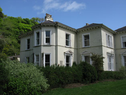 Detached three-bay two-storey over basement house, built c.1790, extensively renovated and enlarged 1866, with addition of entrance porch, block to rear forming pair of recessed flanking bays to main block, and with addition of two-bay block having full-height canted bay window to north-west. Three-bay two-storey block located to north-east, incorporated into main house in nineteenth century renovations. Two-storey extension added to rear c. 1920. Hipped slate roof with over sailing eaves, rendered chimneystacks, cast-iron rainwater goods and rendered eaves course with corbels, flat roof to porch with rendered parapet and corbelled eaves course. Rendered walls having rendered plinth with moulded render sill bands to first and ground floors. Square-headed window openings with cut limestone sills and one-over-one pane timber sliding sash windows. Moulded rendered surrounds to openings, with pediments having scroll consoles to ground floor openings. Tripartite windows to recessed flanking bays, front elevation. Paired round-headed window openings with render sills to rear elevation having lead-lined stained glass windows with family crest surmounted by render hood-mouldings, and having single-light fixed oculus with rendered surround above. Round-headed windows with render sills and moulded rendered archivolts to side elevations of porch, having fixed single-pane windows with overlights. Round-headed door opening to porch flanked by Corinthian columns with moulded archivolt and impost mouldings above. Double-leaf timber panelled door with single-pane fanlight, approached by flight of limestone steps. Hipped slate roof, rendered walls and square-headed window openings with timber sliding sash windows to north-east block. Rubble stone wall with segmental-headed entrance having dressed voussoirs giving access to rear yard. Group of single-storey outbuildings to rear with single pitch slate roofs, rendered walls and square-headed openings with two-over-two pane timber sash windows and timber battened doors. Walled garden to west with rubble stone enclosing walls, camber-headed pedestrian entrance with wrought-iron gate and rubble stone bellcote. Attached octagonal-plan folly to walled garden having conical corrugated-iron roof, rubble stone walls, redbrick quoin bands and ogee arches above square-headed openings. Detached two-bay two-storey gate lodge with projecting gable and timber veranda to east, having pitched tile roof, roughcast rendered walls, and square-headed openings with replacement fittings. Square-profile cut limestone gate piers to east having carved capitals with urn and acorn finials. Wrought-iron gates to central vehicular entrance with flanking pedestrian entrances. Set within own grounds.