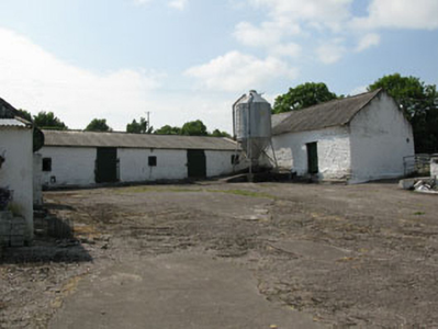 Detached three-bay two-storey farmhouse, built c.1860, with lean-to extension to rear (north). Possibly incorporating fabric of earlier building. Pitched artificial slate roof with rendered chimneystacks and uPVC rainwater goods. Rendered walls with render sill course and continuous label moulding over openings to ground floor. Square-headed window openings with painted stone sills and render surrounds throughout, having two-over-two pane timber sliding sash windows. Square-headed door opening to front (south) elevation with glazed timber door and overlight. Single-storey rubble stone outbuildings to rear having pitched corrugated-iron roofs, square-headed openings with timber battened fittings. Rendered boundary wall to east with square-profile rendered piers flanking wrought-iron gate. Set within own grounds.