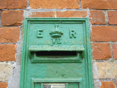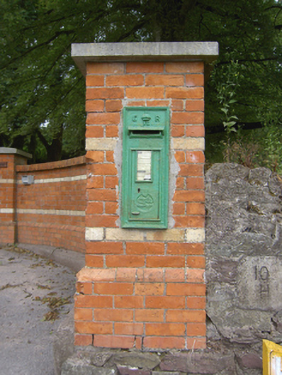 Pier-mounted cast-iron "wall box" post box, extant 1910, with "ER [Edwardus Rex] VII" royal cipher. Set in yellow brick banded red brick Running bond pier.