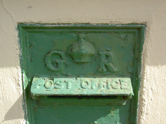 Cast-iron post box, built c. 1915, with G.R., insignia and crown. Set in wall opposite railway station.