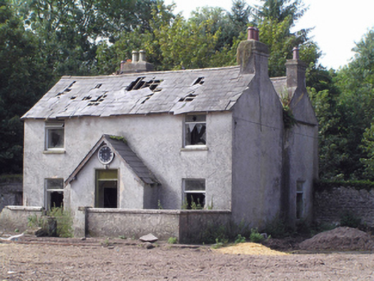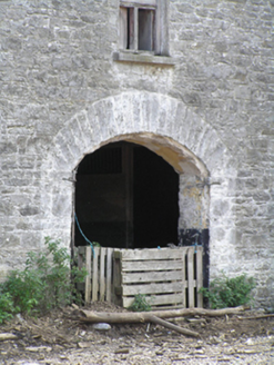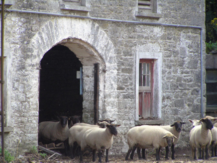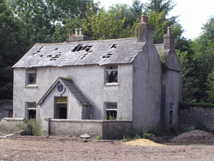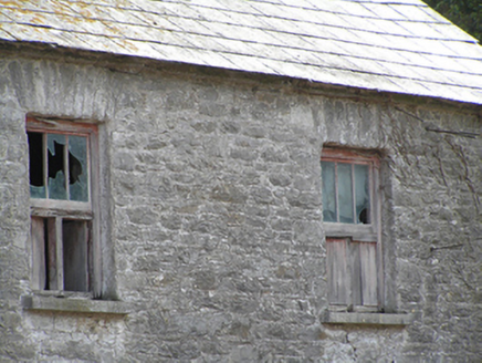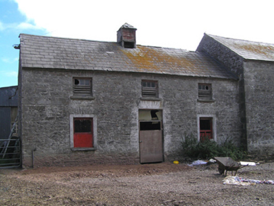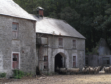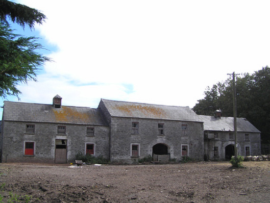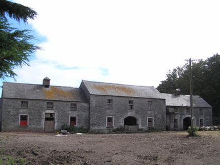 Farmyard complex, built c. 1850, comprising three-bay two-storey outbuilding to centre of east range flanked by three-bay two-storey outbuildings, ruinous and derelict remains of fifteen-bay single-storey outbuilding to south range, three-bay two-storey double-pile farmhouse with single-bay gabled porch to front (east) elevation to west range, and ruinous and derelict remains of single-storey outbuildings to non-continuous north range. East range with pitched slate roofs, sheeted timber vents, rubble stone walls, square-headed openings with dressed limestone voussoirs, cut limestone sills and timber battened and louvred fittings, and segmental-headed carriage arches with dressed limestone voussoirs. Remains of pitched slate roofs to south range, having rendered walls and square-headed openings with steel fixed and pivoting windows. House to yard comprising double-pile pitched roofs with rendered end chimneystacks, rendered walls and square-headed openings with replacement uPVC windows and door. Garden wall with remains of square-profile piers to front of house, rubble stone boundary wall to either side of rear of house. Roofless remains of two-bay single-storey outbuilding to east end of north range, having rubble stone walls, square-headed openings with dressed limestone voussoirs, and segmental-arched door opening to east gable formed by partially blocked carriage arch, having dressed limestone voussoirs and red brick dressings. Ruinous remains of outbuilding to west end of north range.