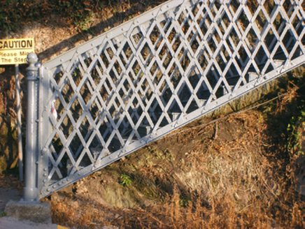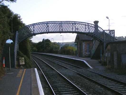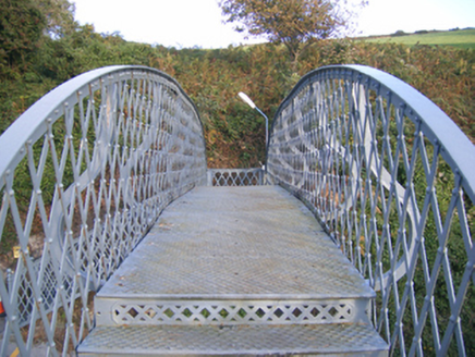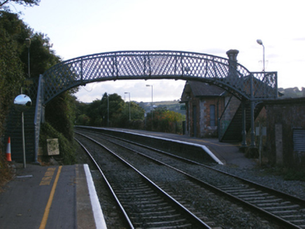 Single-span cast-iron pedestrian bridge over railway line, erected 1862, comprising cast-iron lattice walkway supported on circular-profile cast-iron columns with banded pedestals, with flights of steps having circular-profile newel posts with acorn finials to each side of platform.