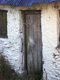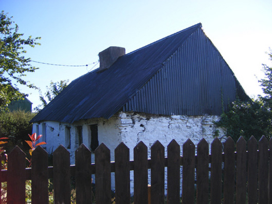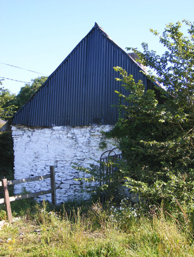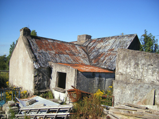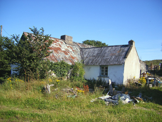 Detached T-plan five-bay single-storey house, built c. 1800, with single-bay single-storey pitched-roofed block to central bay of rear (west) elevation and single-bay-single-storey flat-roofed addition to rear, south bay. Now disused. Pitched corrugated-iron roof with rendered chimneystacks and render copings to gables. Painted rubble stone wall. Rendered walls to rear. Square-headed openings, some now infilled with timber. Square-headed opening to rear block with three-pane timber casement window. Square-headed door opening with timber battened door.