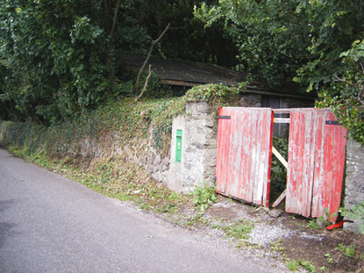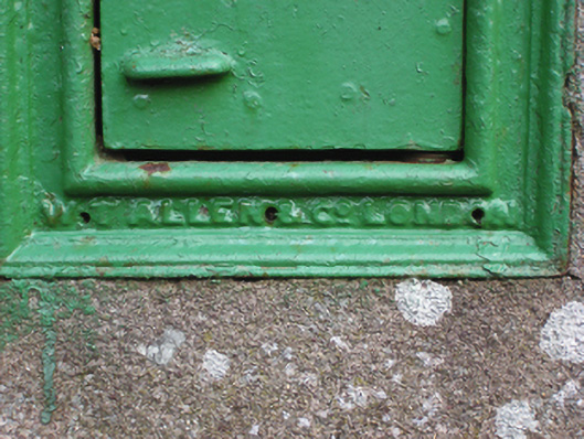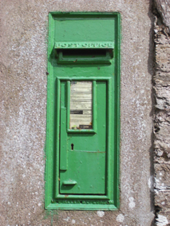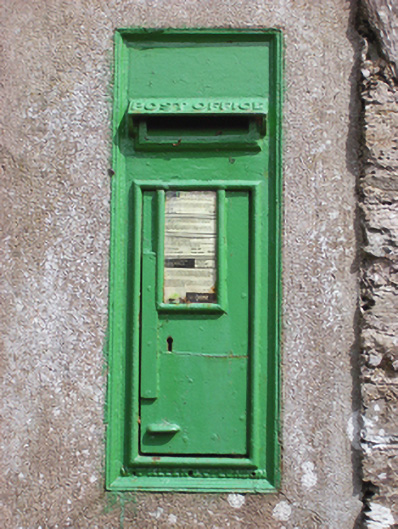 Wall-mounted cast-iron post box, c. 1940, with lettering in relief. Set into rendered wall.
