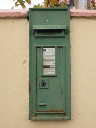 Wall-mounted cast-iron post box, c.1950, with lettering in relief. Set into rendered wall.