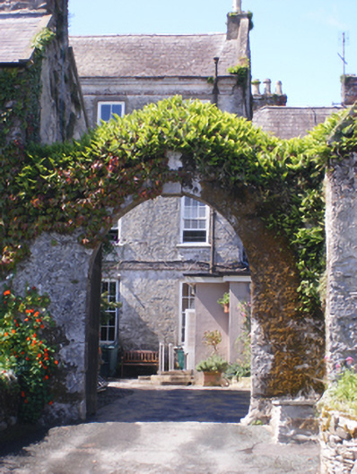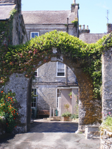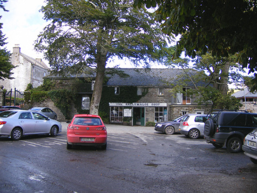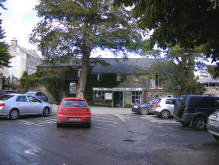 Complex of outbuildings, built c. 1790. Multiple-bay two-storey outbuilding to south with rubble stone bellcote to north gable and recent glazed conservatories to east. Pitched slate roof with render eaves course. Bellcote with cut stone coping and round-headed opening. Rubble stone walls to east and rendered walls to west. Square-headed openings with replacement windows. Six-bay single-storey block to east, adjoined by single-storey lean-to, with pitched artificial slate roof, rendered walls, rubble stone to gable. Square-headed openings with fixed timber windows. Camber-arched opening to north with red brick block-and-start surround and voussoirs and fixed window. Four-bay two-storey former outbuilding to south, now in use as shop, with projecting end bay to west and two-bay single-storey extension to east of front (south) elevation . Hipped slate roof, rubble stone walls. Square-headed openings with replacement windows and doors. Gable-fronted single-bay three-storey former gate house, with pitched slate roof, render copings and rendered chimneystack, rendered walls, square-headed openings with replacement windows and round-headed opening with replacement door. Pointed arch carriage-arch attached to south with rendered walls and carved limestone keystone, dated 1701, with inscribed lettering to soffit.